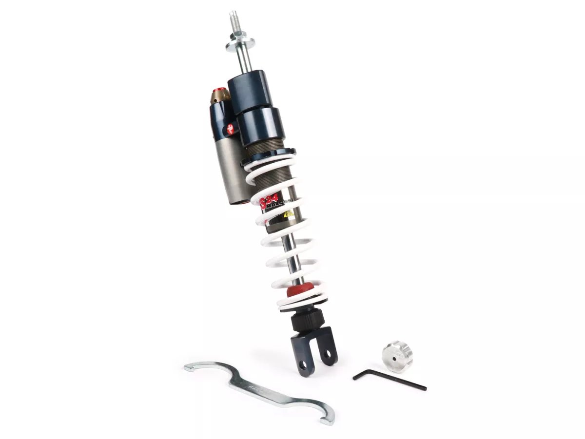 Der RS24 Stoßdämpfer wird von Paioli exklusiv für Malossi gefertigt. Die einstellbaren Stoßdämpfer lassen wenig Wünsche offen. Die Federvorspannung kann mit dem im Lieferumfang enthaltenen Hakenschlüssel optimal auf Fahrergewicht und Zuladung eingestellt werden. Die Dämpfung selbst kann in der Zugstufe über ein Stellrad auf die Fahrweise angepasst werden.